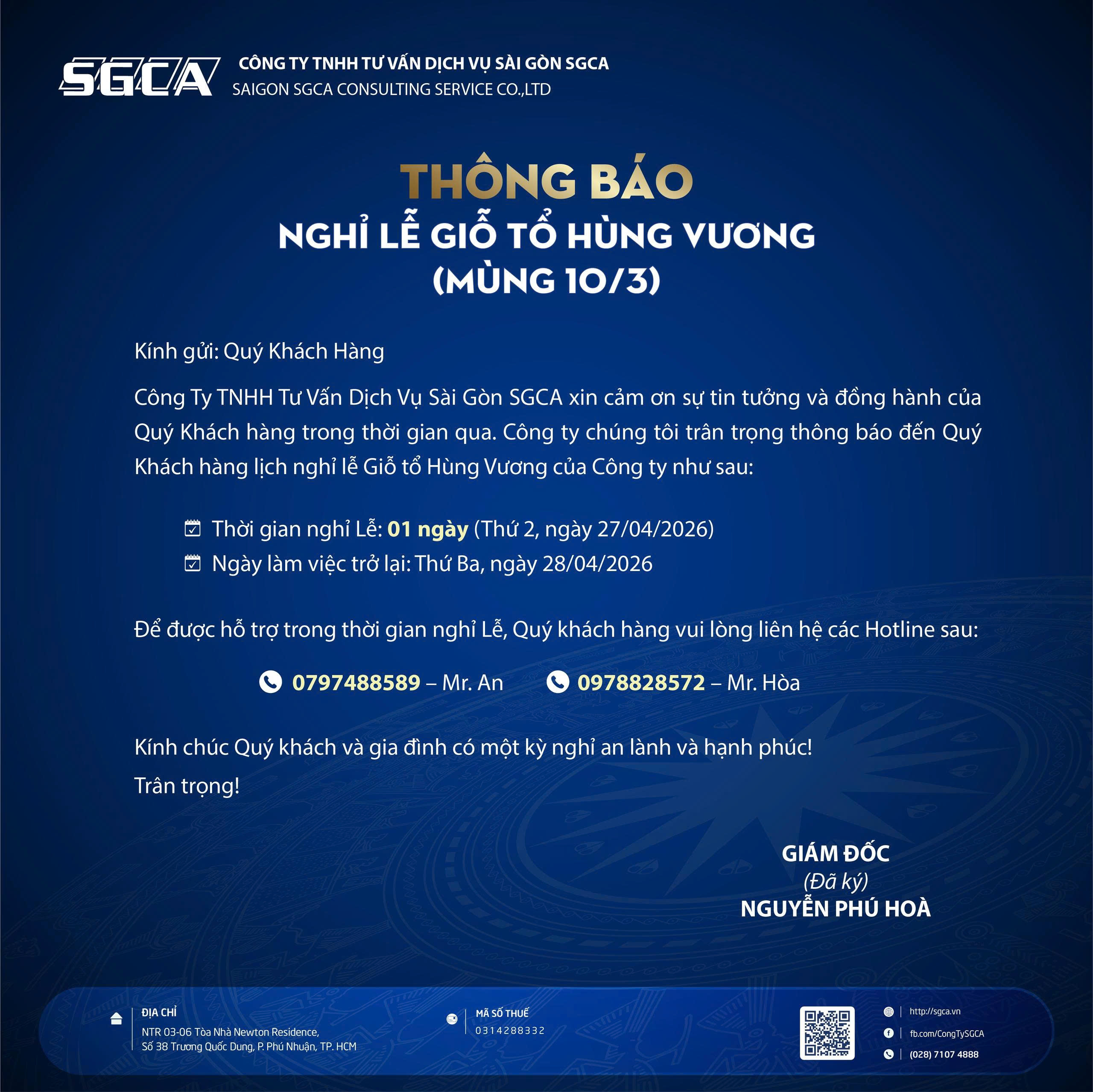 Công ty TNHH Tư vấn Dịch vụ Sài Gòn SGCA kính chúc Quý Khách hàng và Quý Đối tác có một ngày nghỉ lễ an lành – hạnh phúc.